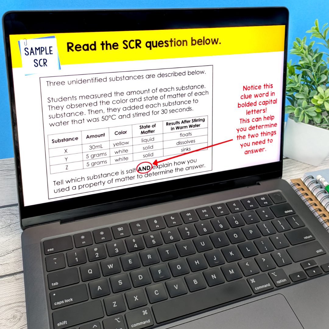 To prepare for this item type, we offer this set of 30 Short Constructed Response (SCR) questions in Google Forms and SCR Detectives Slideshow Lessons.